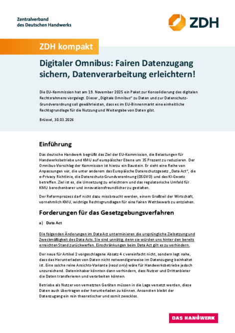 Das deutsche Handwerk begrüßt das Ziel der EU-Kommission, die Belastungen für Handwerksbetriebe und KMU auf europäischer Ebene um 35 Prozent zu reduzieren. Der Omnibus-Vorschlag der Kommission ist hierzu ein Baustein. Er sieht eine Reihe von Anpassungen vor, die unter anderem das Europäische Datenschutzgesetz “Data Act”, die