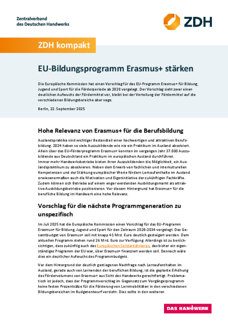Im weiteren Verfahren werden sich das Europäische Parlament und die Mitgliedsstaaten mit diesem Vorschlag befassen. Aus Sicht des ZDH muss unbedingt sichergestellt werden, dass bei der Umsetzung der neuen Programmgeneration die Förderung der Lernmobilität im Ausland weiterhin im Zentrum von Erasmus+ liegt. Für die Berufsbildung muss zukünftig außerdem ein deutlicher Zuwachs der Fördermittel bei Erasmus+ festgeschrieben werden. Nur so ist es möglich, dass zukünftig mehr Auszubildende, junge Fachkräfte sowie Ausbildende aus dem Handwerk ein Auslandspraktikum absolvieren können. Darüber hinaus muss das Programm insbesondere bei der Projektadministration deutlich verschlankt und effizienter gestaltet werden. Überdies benötigen im Rahmen von Erasmus+ akkreditierte Organisationen zukünftig mehr Planungssicherheit über die von ihnen beantragten Fördermittel.