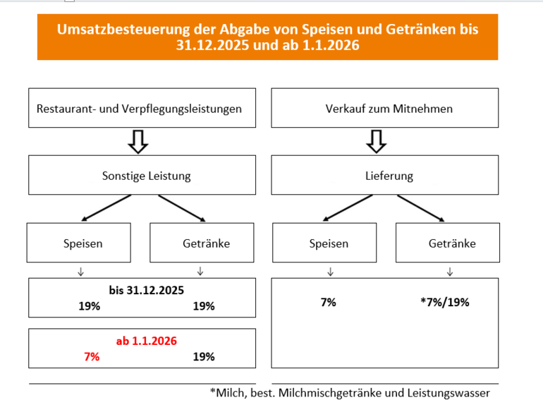 Durch das Steueränderungsgesetz 2025 wird der Umsatzsteuersatz für Restaurant- und Verpflegungsdienstleistungen (mit Ausnahme der Abgabe von Getränken) ab dem 1.1.2026 dauerhaft von 19% auf 7% abgesenkt.